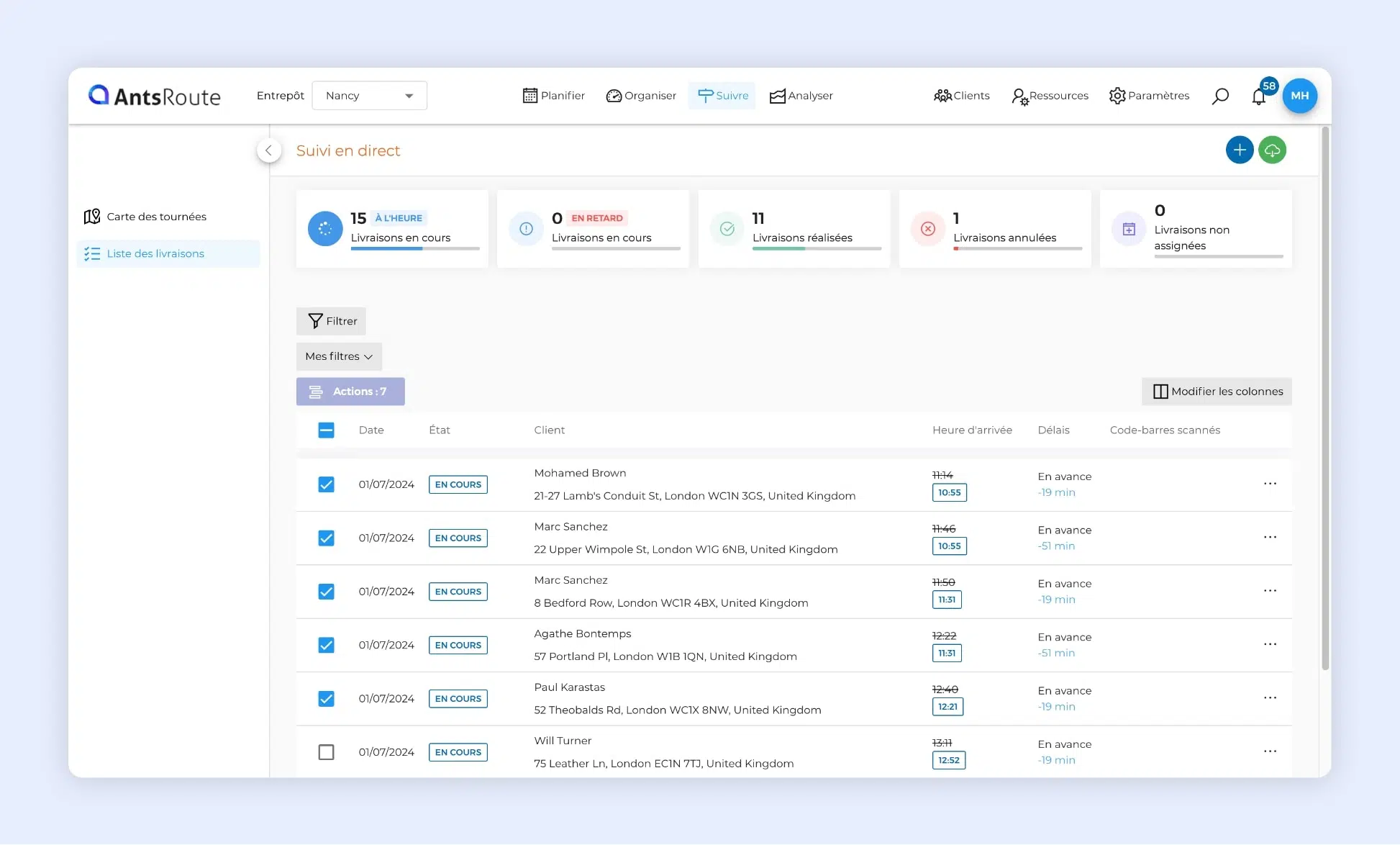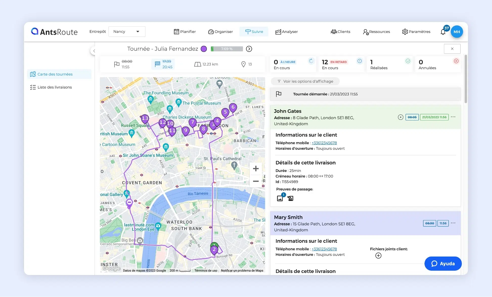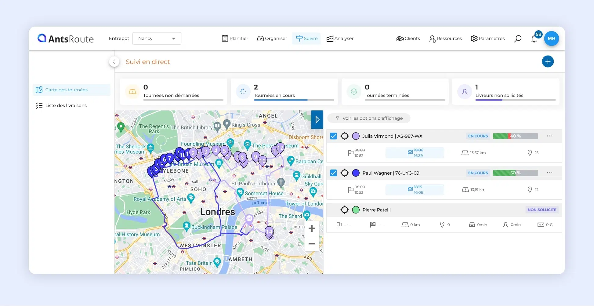 Le suivi de deux tournées en cours sur AntsRoute.