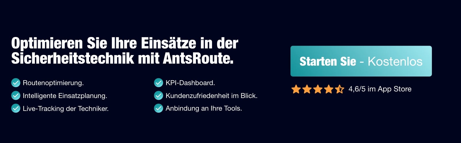 Weniger unnötige Kilometer, flexible Zeitpläne, eine bessere Verteilung der Aufträge und vor allem bis zu zwei zusätzliche Einsätze pro Techniker und Tag – das sind die Vorteile, die sich durch die Umstellung auf ein optimiertes Management mit AntsRoute ergeben. Ihre Kunden können schneller reagieren, Ihre Techniker haben mehr Komfort und Ihr Unternehmen wird profitabler. Wie wäre es, wenn Sie noch heute eine neue Art der Einsatzplanung mit AntsRoute kostenlos ausprobieren?