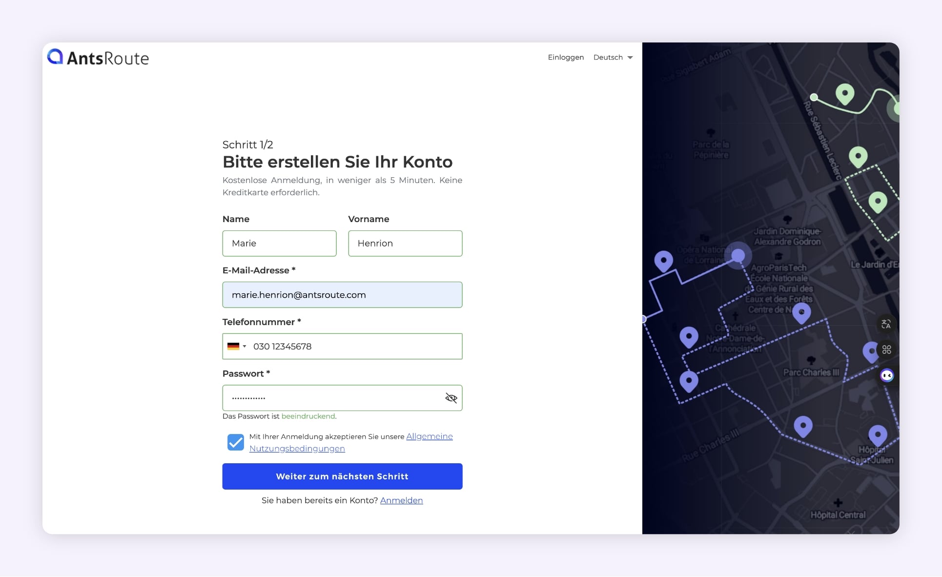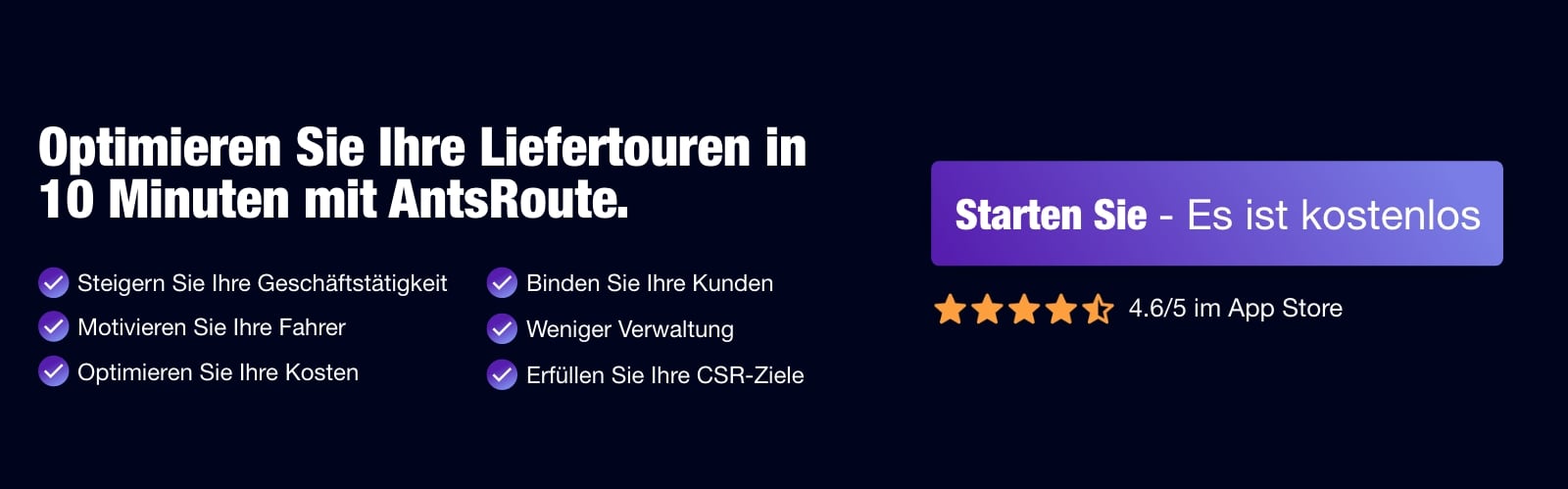 Erstellen Sie Ihr Konto in einer Minute, testen Sie AntsRoute ohne Risiko und überzeugen Sie sich selbst. Sie haben nichts zu verlieren – außer stundenlanger manueller Planung. Starten Sie jetzt Ihre kostenlose Testversion von AntsRoute!