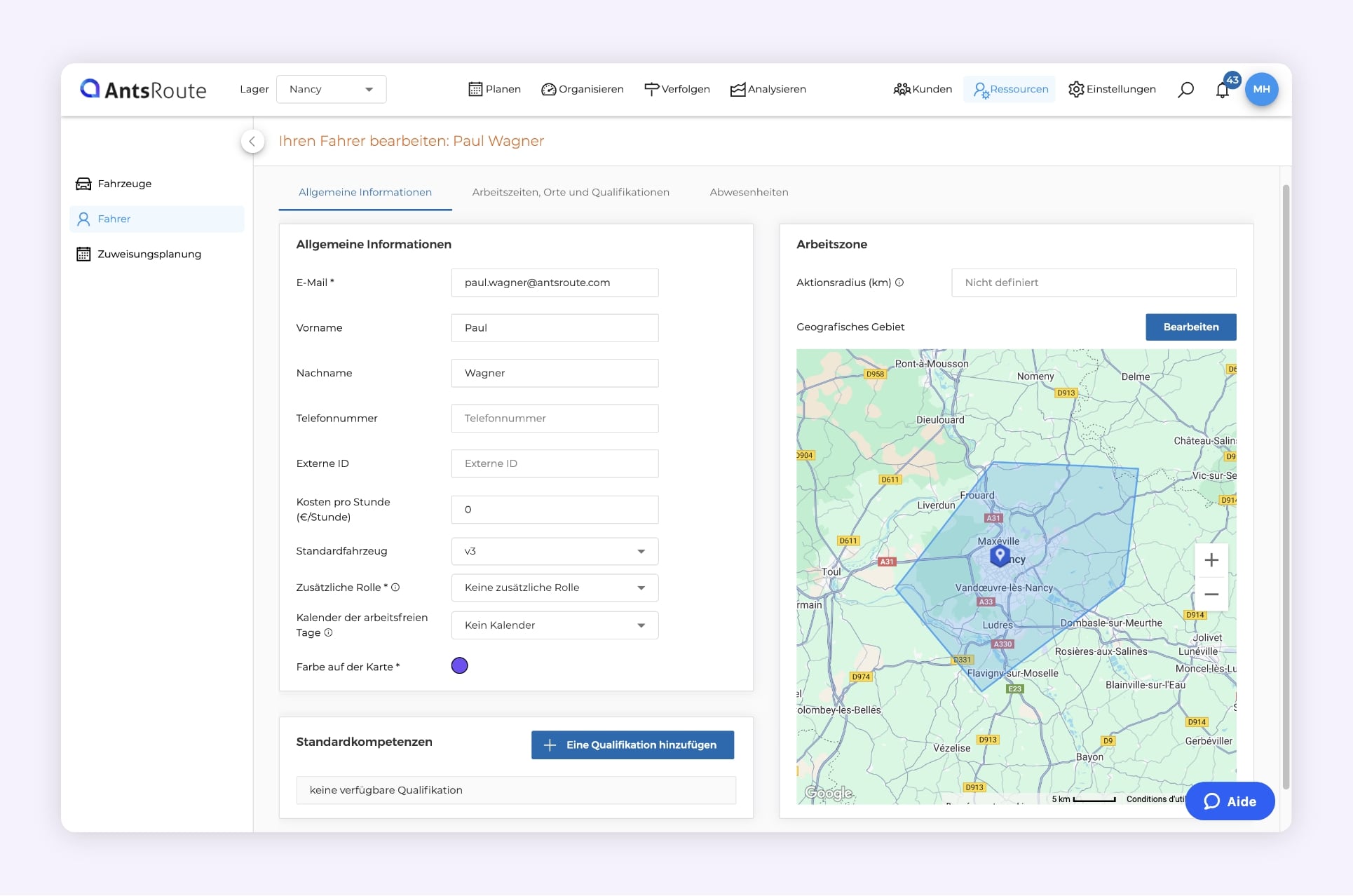 Jeder Zusteller ist das Herzstück der Optimierung: Seine Arbeitszeiten, sein Abfahrts- und Rückkehrort beeinflussen direkt den Aufbau der Touren. Wenn Sie diese Parameter richtig anpassen, erhalten Sie realistischere und leistungsfähigere Touren.