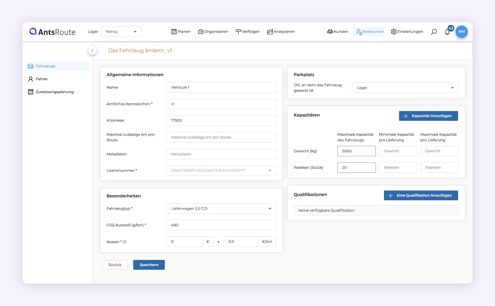 • Ihre Fahrzeuge und deren Kapazitäten festlegen (falls erforderlich);