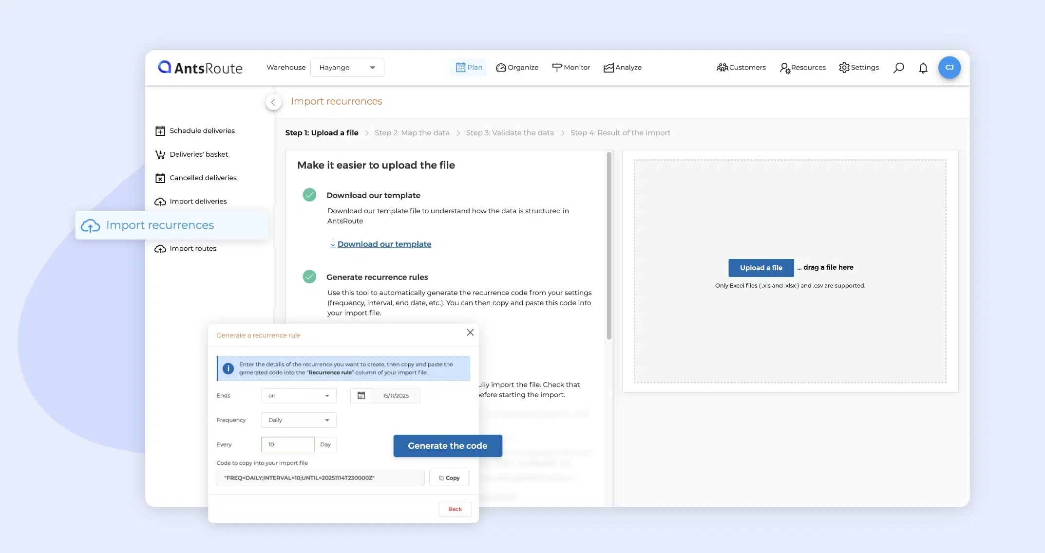 Do you manage repeated jobs (daily, weekly, monthly, etc.)? AntsRoute now lets you create them in bulk by importing an Excel or CSV file. For planning teams, this update puts an end to time-consuming manual entry: structure your file, generate the recurrence rule, import, and you’re good to go.