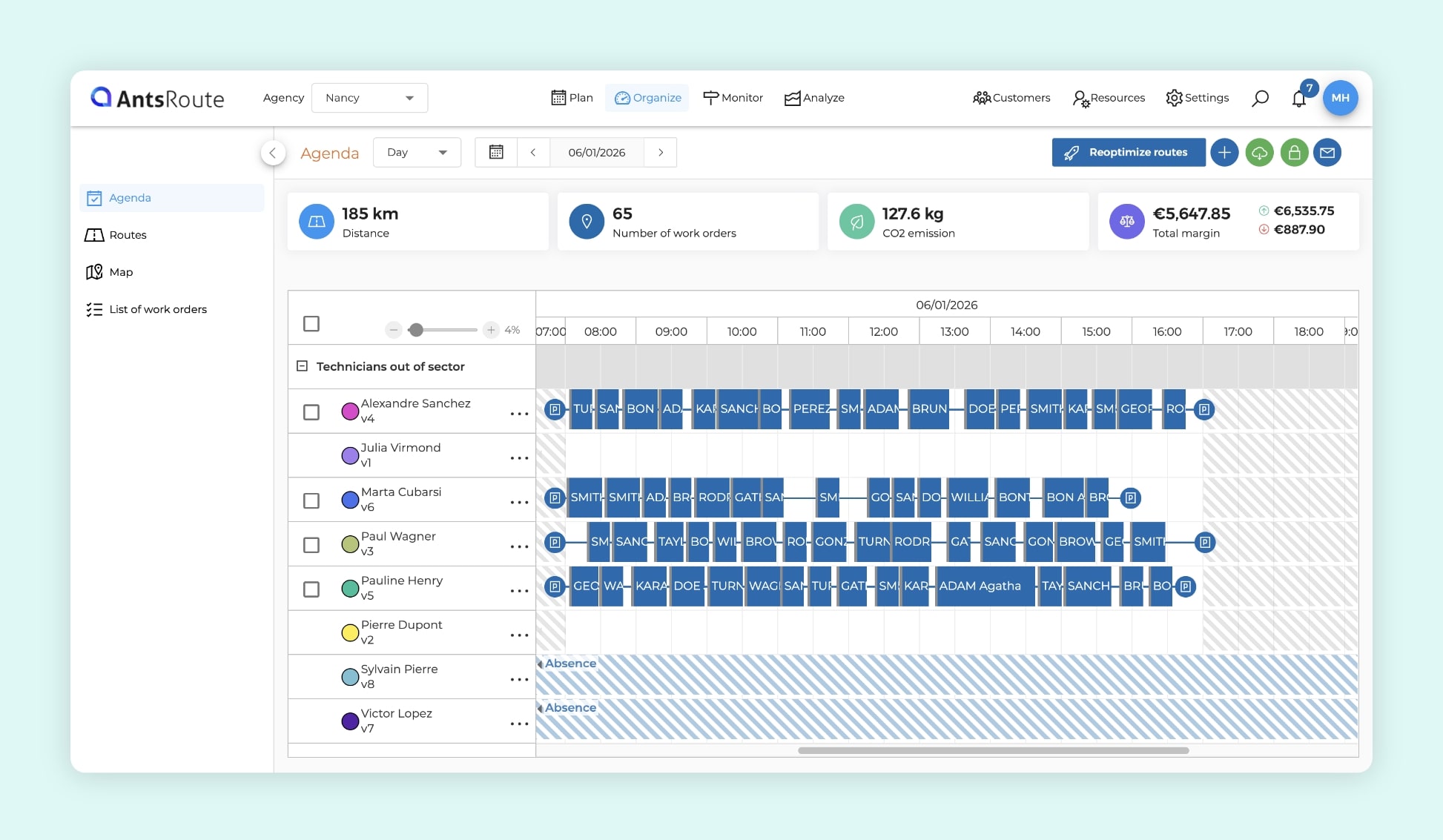 AntsRoute analyses in seconds what a human planner would take hours to organise: travel times, available time slots, technician skills, job durations, onboard inventory, and more.
