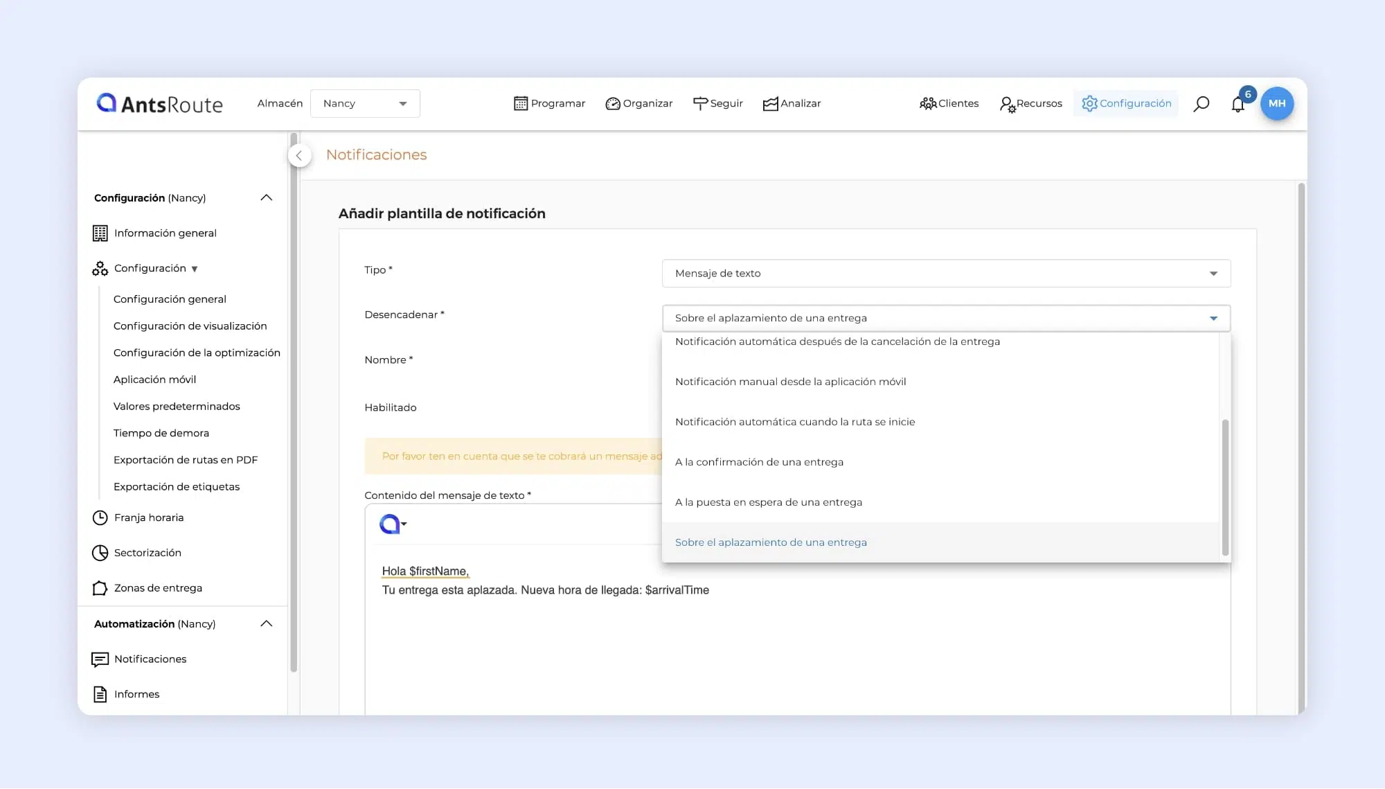 Adición de una plantilla de notificación para el aplazamiento de una entrega en AntsRoute.