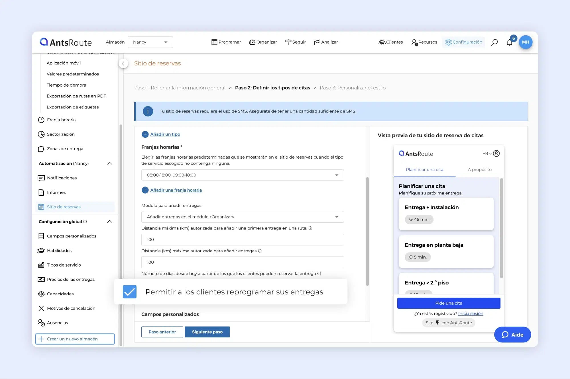Activación de la función «Permitir a los clientes reprogramar sus entregas» en AntsRoute.