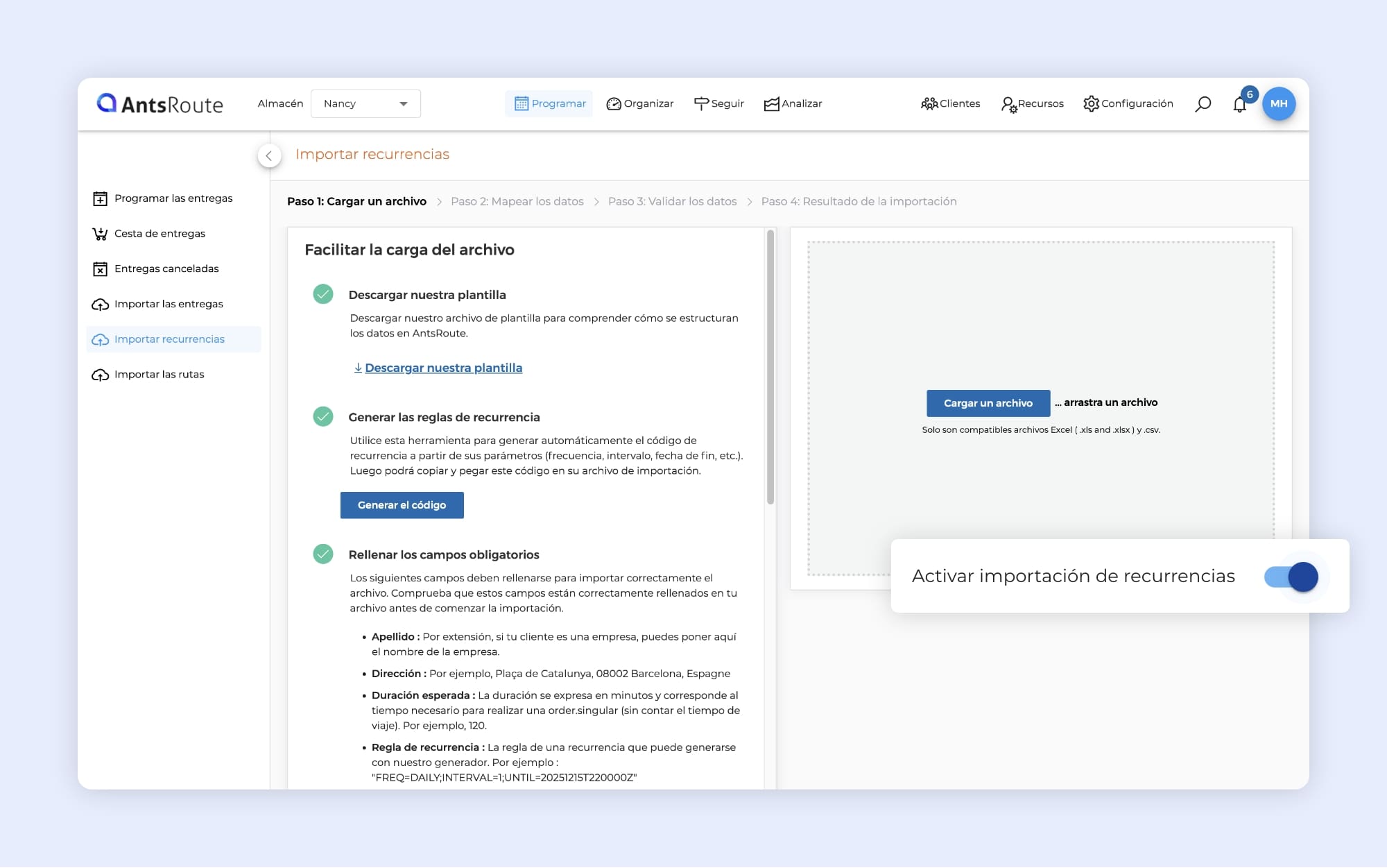 Durante la última puesta en producción de nuestro software AntsRoute, te presentamos una novedad muy esperada: la posibilidad de añadir recurrencias de forma masiva mediante la importación de un archivo Excel o CSV.