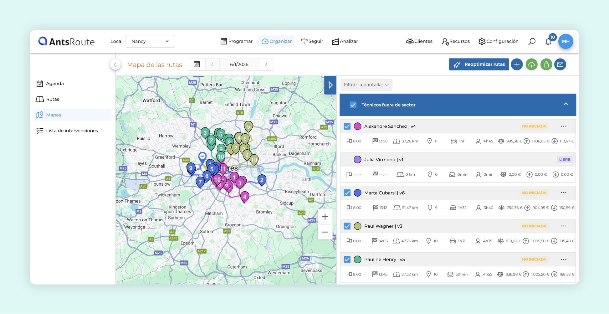 AntsRoute analiza en pocos segundos lo que a un planificador humano le llevaría horas organizar: trayectos, franjas horarias disponibles, competencias de los técnicos, duraciones de las intervenciones, stock embarcado…