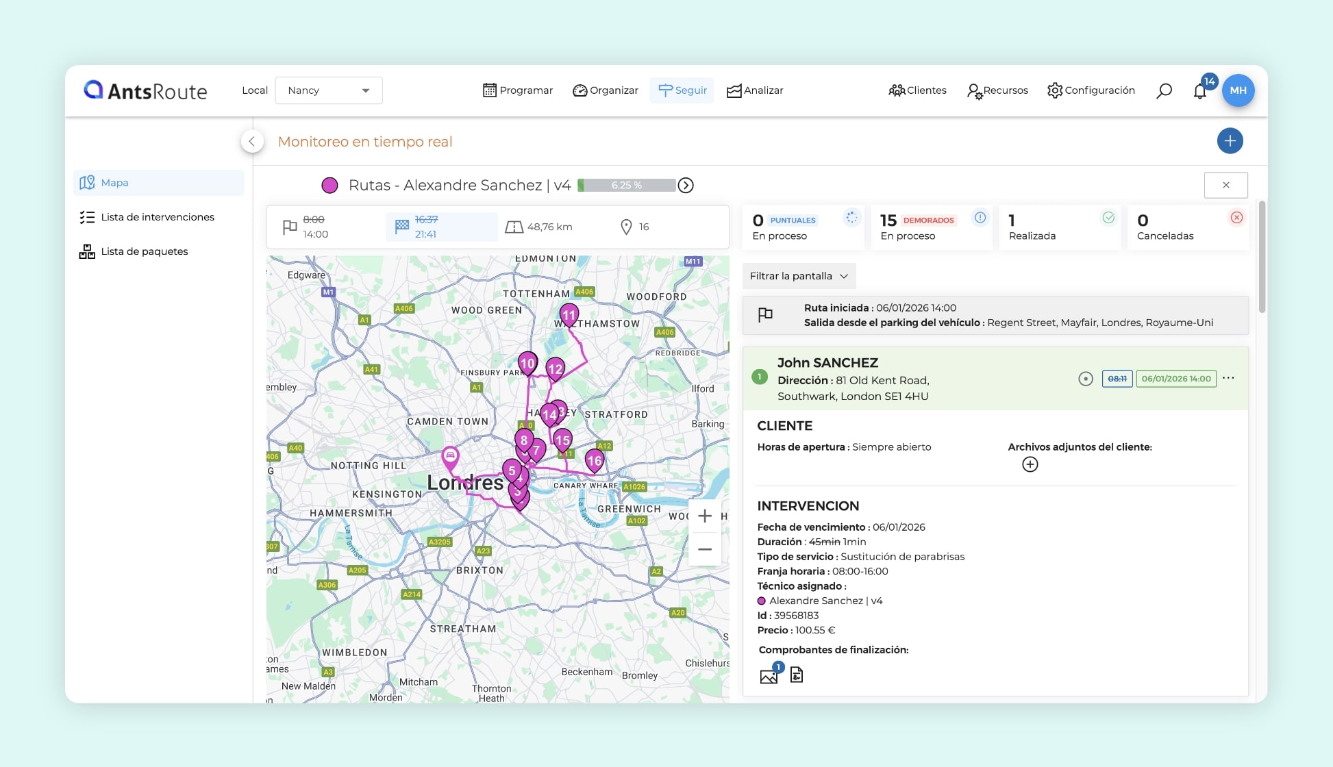 - La optimización con AntsRoute marca la diferencia: menos kilómetros, planificación fiable, mayor reactividad y una mejor satisfacción del cliente.