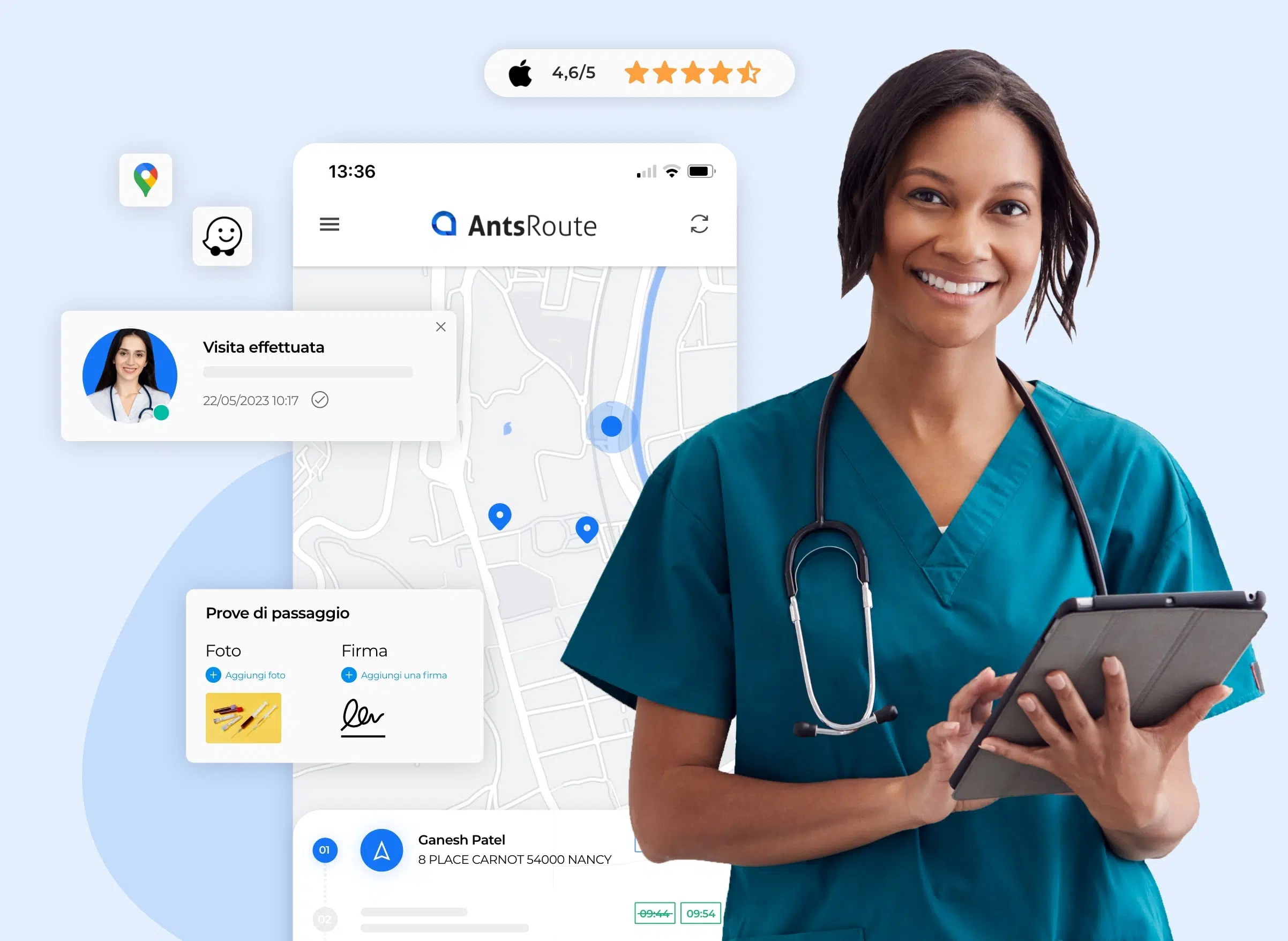 Grazie all’applicazione mobile AntsRoute, disponibile su Android e iOS, i professionisti sanitari possono recuperare le tappe dei loro giri e accedere a tutti i dati relativi ai pazienti e alle cure da erogare:
