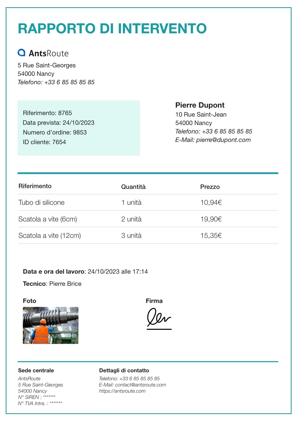 Con l’applicazione mobile AntsRoute, non appena un tecnico ha terminato un intervento o una tappa del suo giro, un rapporto completo viene editato automaticamente online, contenente tutte le informazioni che saranno state giudicate pertinenti: