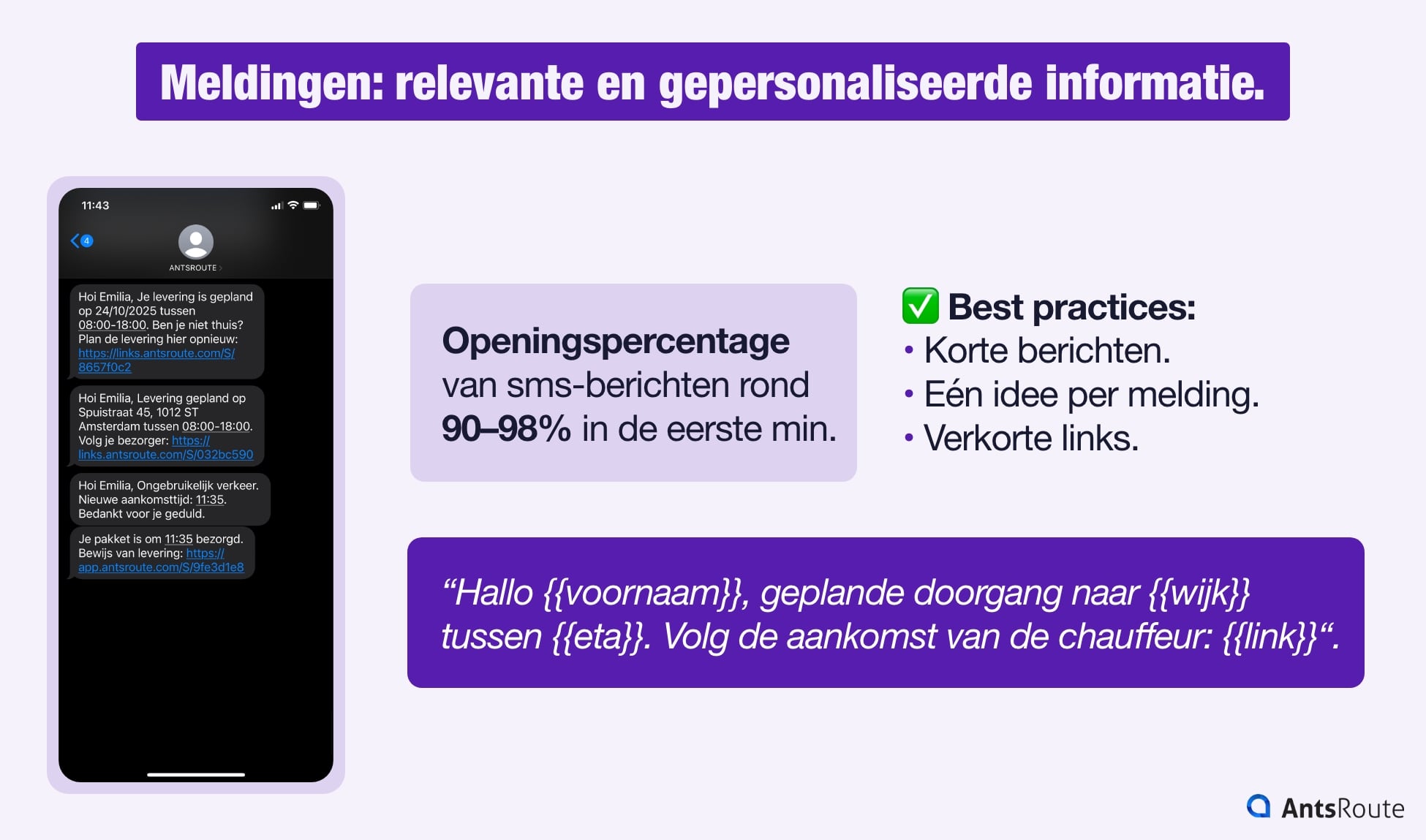 Streef naar korte, duidelijke berichten met slechts één onderwerp per melding en verkorte links die gemakkelijk aan te raken zijn. Pas systematisch aan met dynamische variabelen: {{voornaam}}, {{adres}} en {{eta}}. Het doel is dat het bericht de ontvanger echt aanspreekt.
