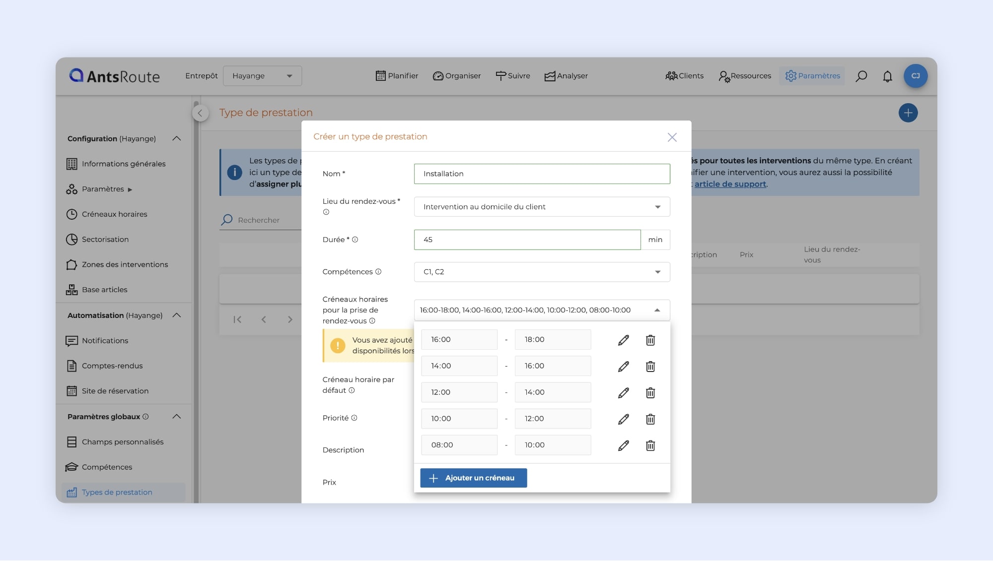 AntsRoute vous permet désormais d’aller plus loin dans la personnalisation de vos créneaux horaires. Grâce à la fonctionnalité Types de prestation, vous pouvez configurer jusqu’à 12 créneaux horaires différents pour un même type de prestation, contre 4 auparavant.