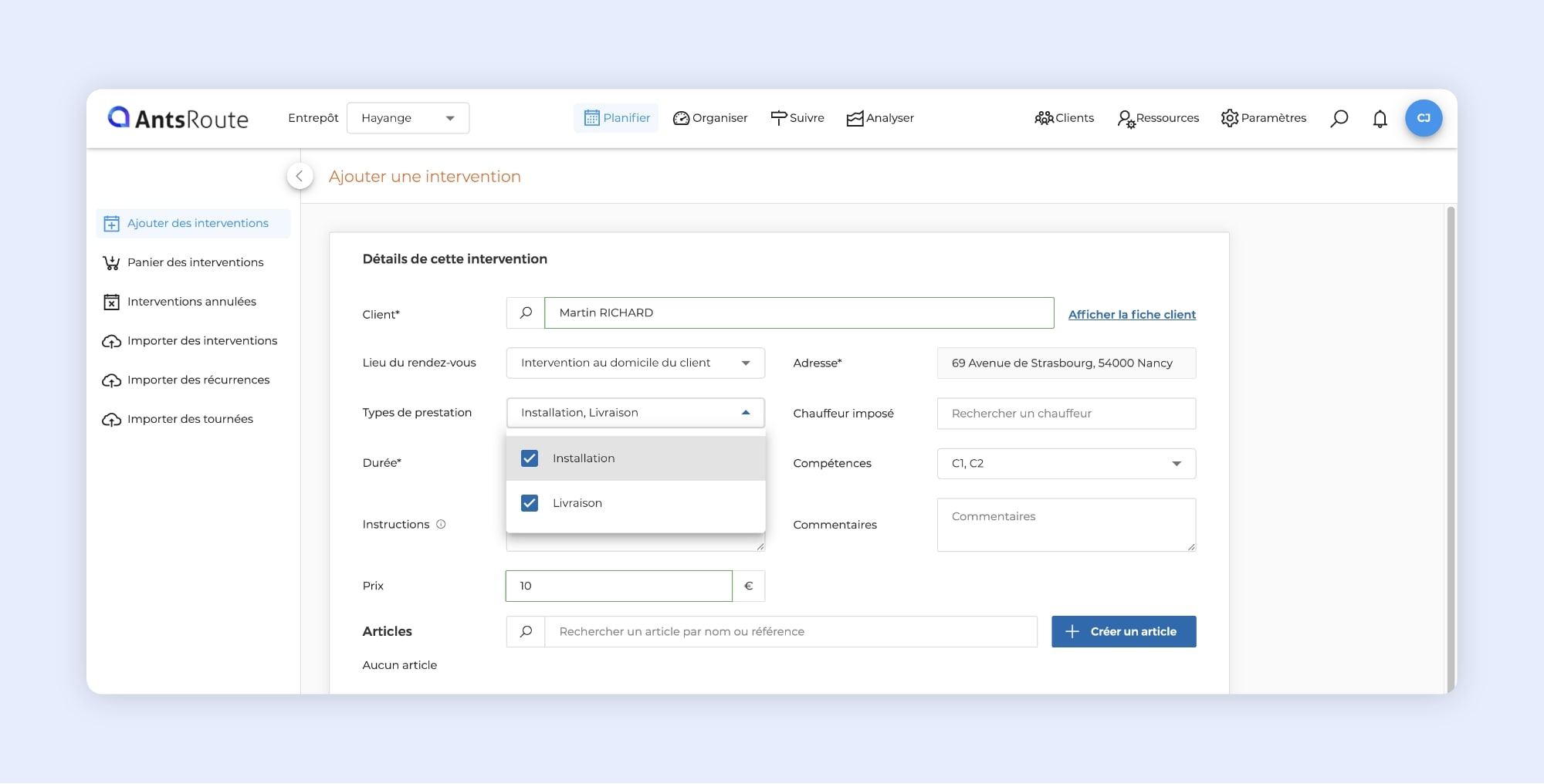 AntsRoute vous permet désormais de sélectionner plusieurs types de prestation lors de la planification d’une même intervention ou livraison. Cette évolution facilite la gestion des missions complexes.