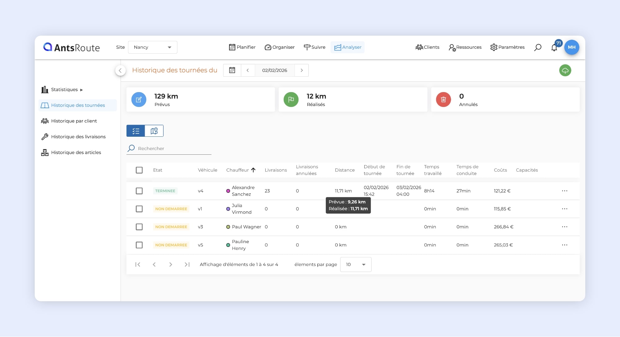 • Historique des tournées : une analyse plus complète de votre activité