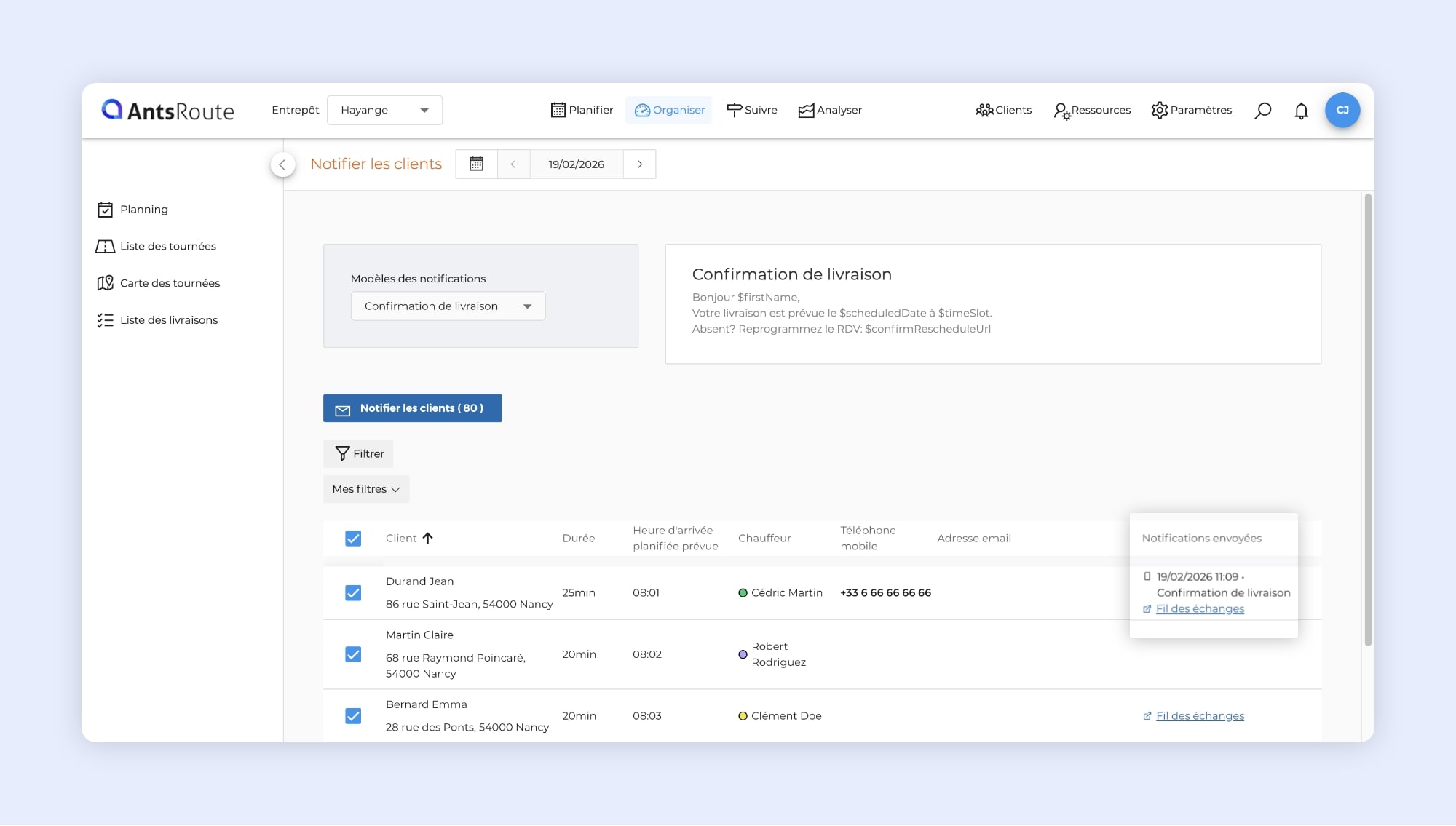 L’accès au fil des échanges d’un client sur AntsRoute.