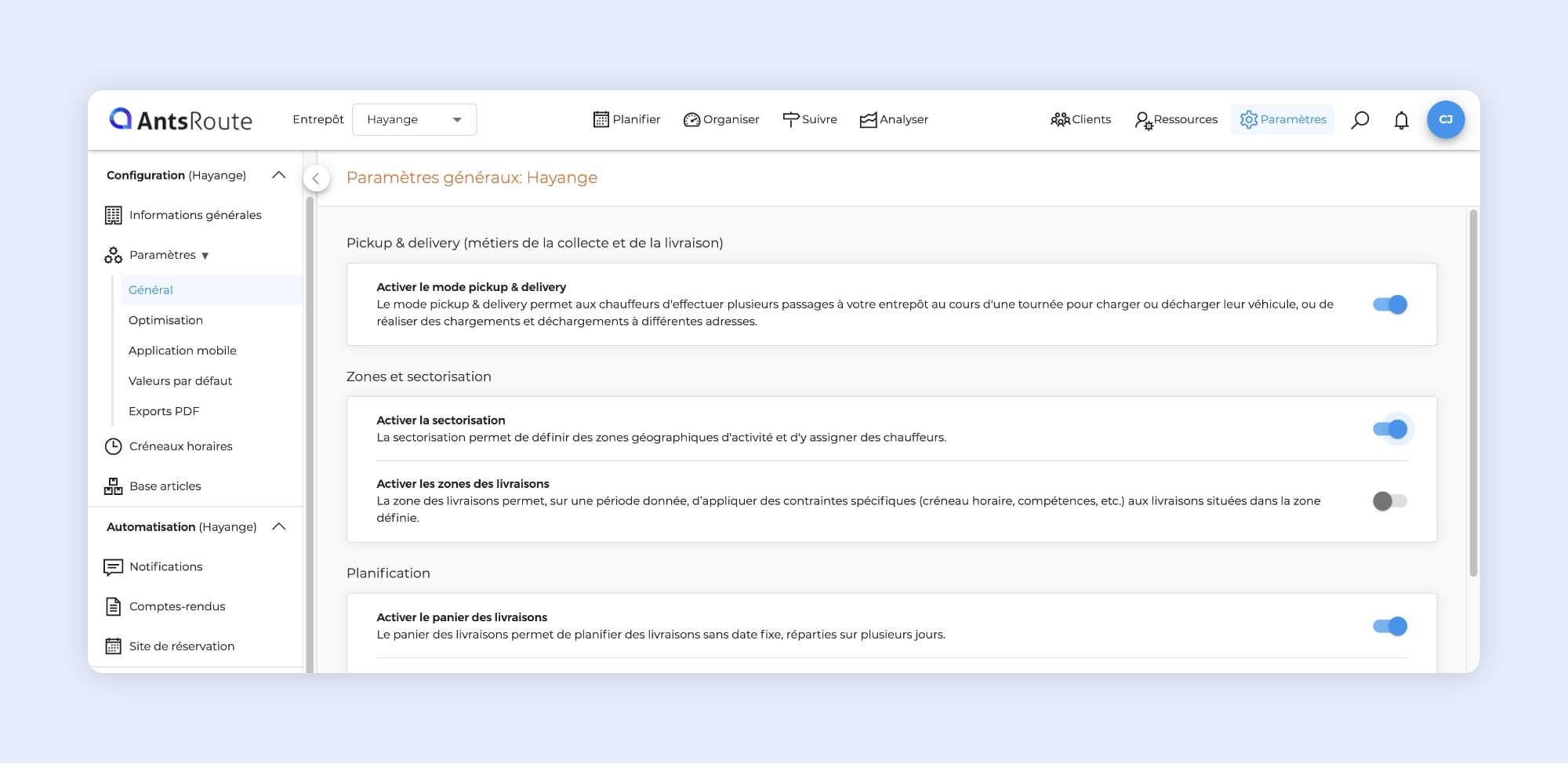 La gestion des paramètres sur AntsRoute.