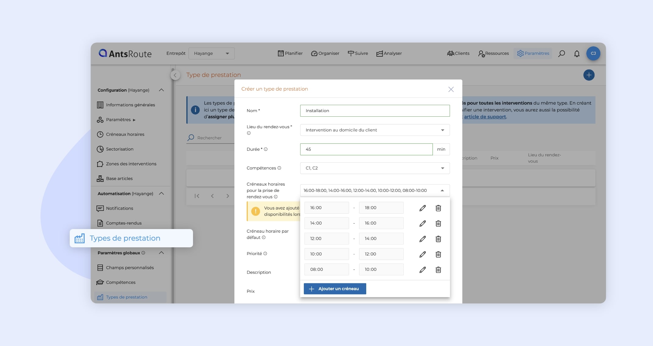 AntsRoute vous permet désormais d’aller plus loin dans la personnalisation de vos créneaux horaires. Grâce à la fonctionnalité Types de prestation, vous pouvez configurer jusqu’à 12 créneaux horaires différents pour un même type de prestation, contre 4 auparavant.