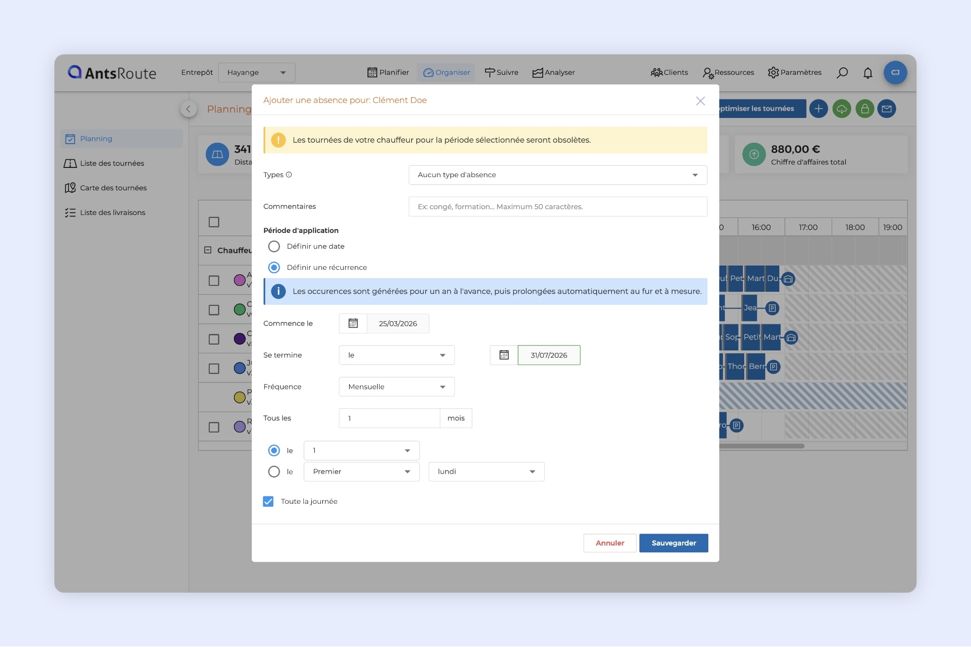 La création d’une absence récurrente sur AntsRoute.
