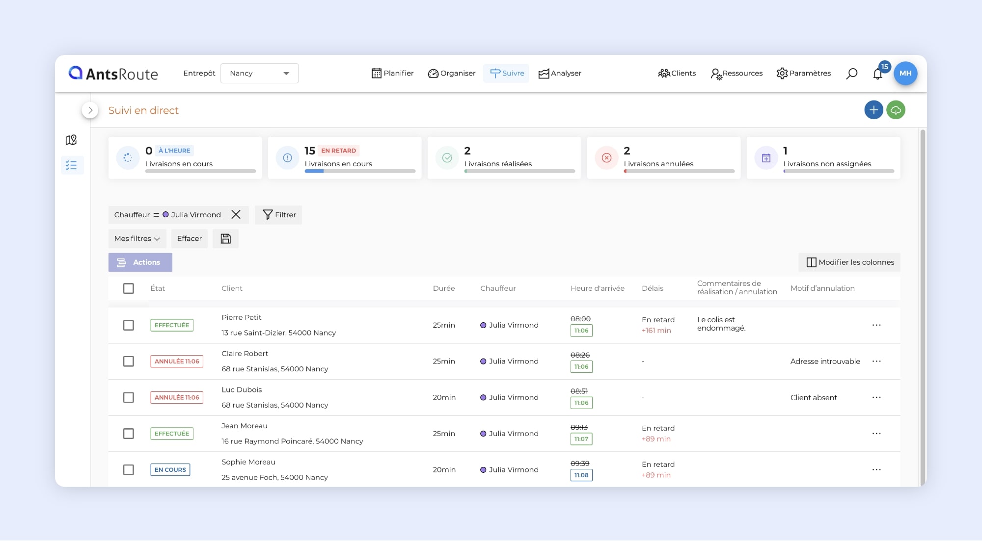 AntsRoute enrichit l’onglet Suivre > Liste des interventions avec l’affichage des commentaires de réalisation, des commentaires d’annulation et des motifs d’annulation.