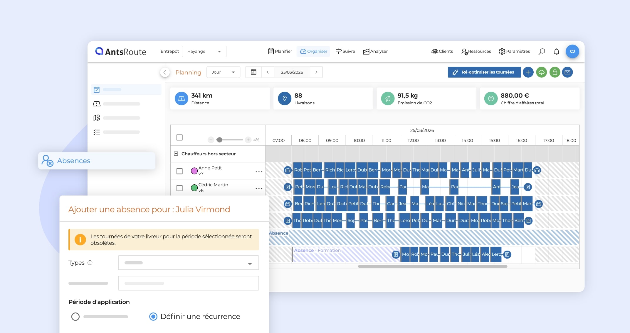 Une fois configurées, ces absences sont automatiquement intégrées dans vos processus de planification. AntsRoute s’assure ainsi de ne pas assigner des missions sur ces créneaux.